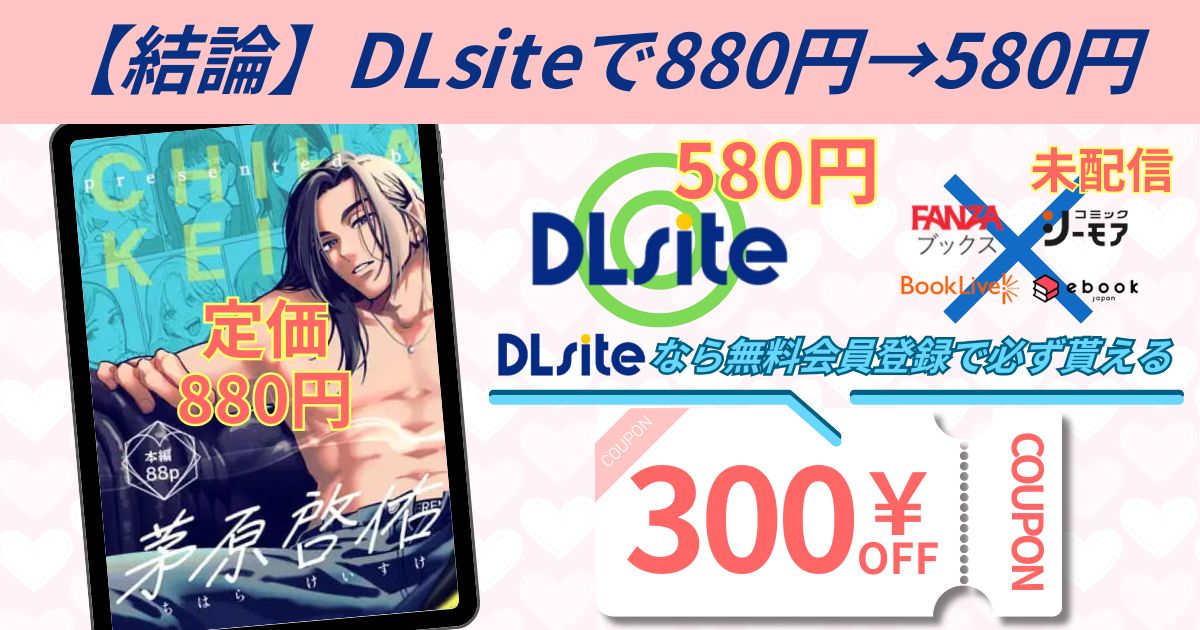 DLsiteでは初回クーポンを利用することで、通常880円の茅原啓佑の×恋が580円で読めるため、安全かつお得に楽しめるでしょう。